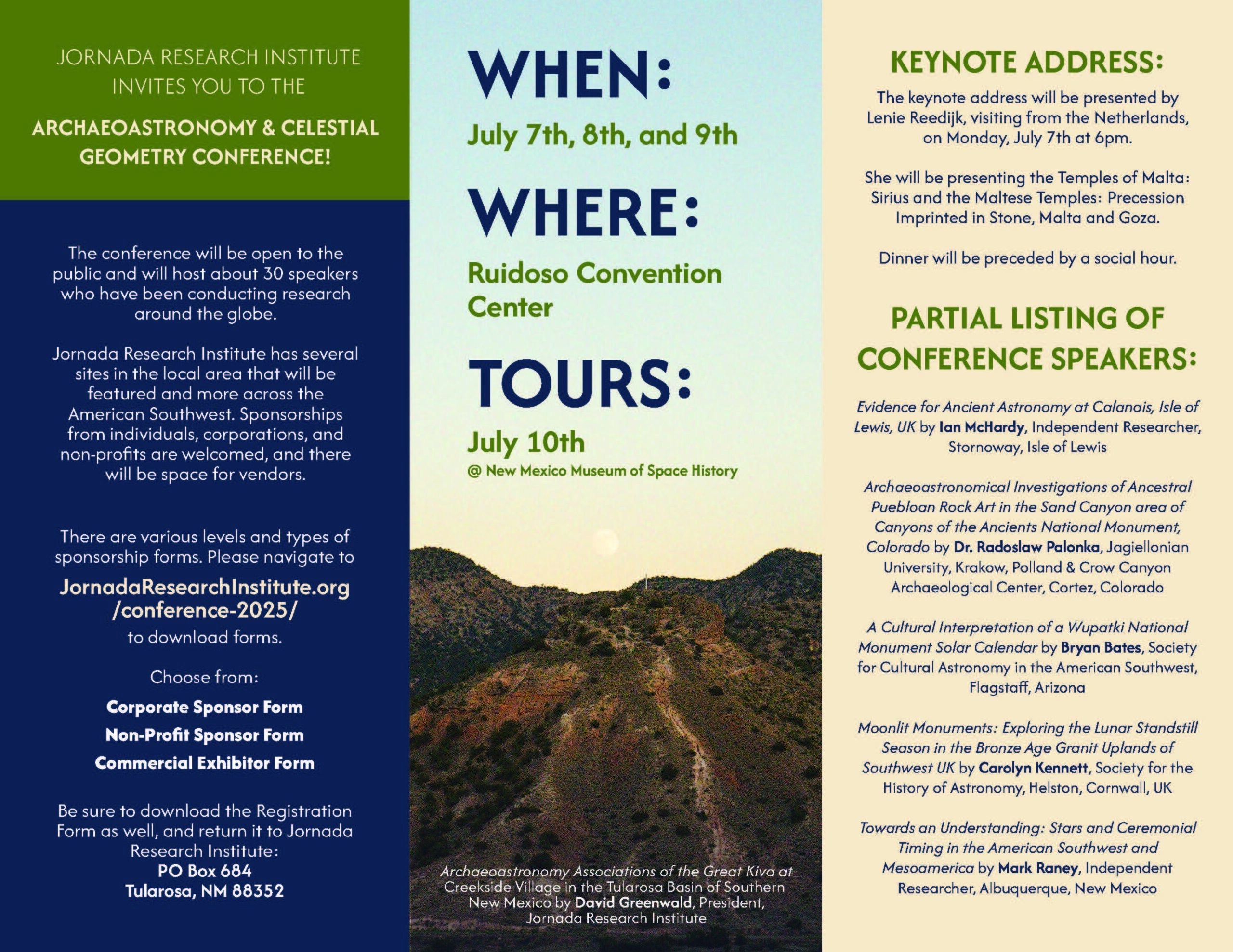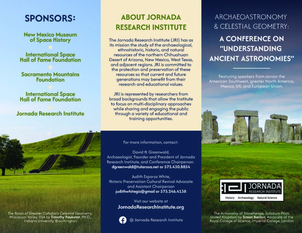 JRI is in principal charge of organizing this conference and we are seeking sponsors and supporting organizations. If you would like to help, please contact David Greenwald or Judith White, to find out how you can help. The conference will be open to the public and we plan to have about 30 speakers who have been conducting research around the globe. We have several sites in the local area that we will be featuring and more across the American Southwest. We welcome sponsorships from individuals, corporations, non-profits and we will have space for vendors.