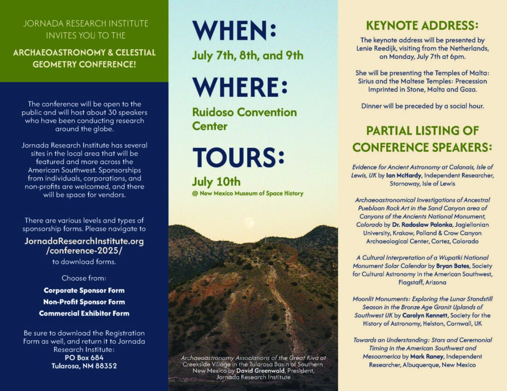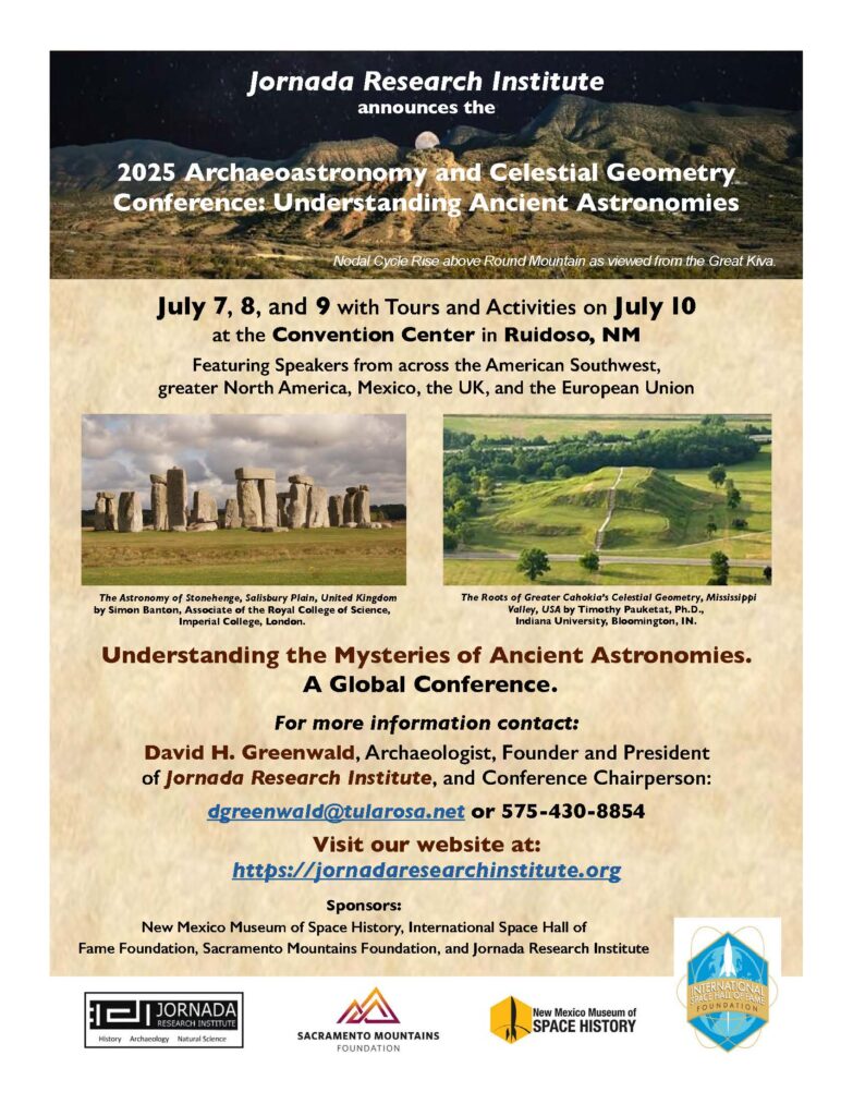 9. David Greenwald, Jornada Research Institute, Tularosa, New Mexico, and John Groh, Torrance County Archaeological Society and Jornada Research Institute. Archaeoastronomy Associations of the Great Kiva at Creekside Village, a Formative Period Irrigation Community in the Tularosa Basin of Southern New Mexico.