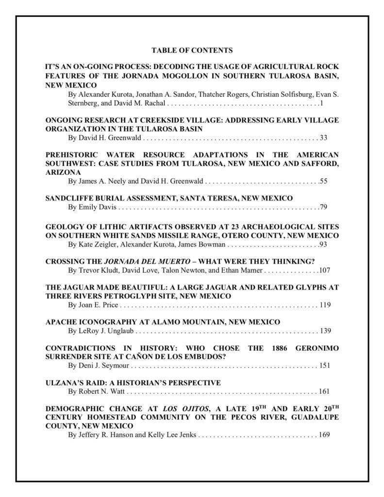 PRESERVING, INTERPRETING, AND RECONSTRUCTING HISTORY THROUGH ARCHIVAL STUDIES, LANDSCAPE ARCHAEOLOGY AND FIELD RESEARCH (Proceedings of the 2019 Tularosa Basin Conference edited by David H. Greenwald, Nancy J. Hewitt, and Alexander Kurota.